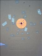 | The target stand on the right blew over and I took a picture of the targets before I continued. I was shooting the targets in a quasi-random order. For each five shot magazine I would put at least one bullet on each target before shooting a target a second time. Each shot took, on the average, about one second from 106 yards away. |