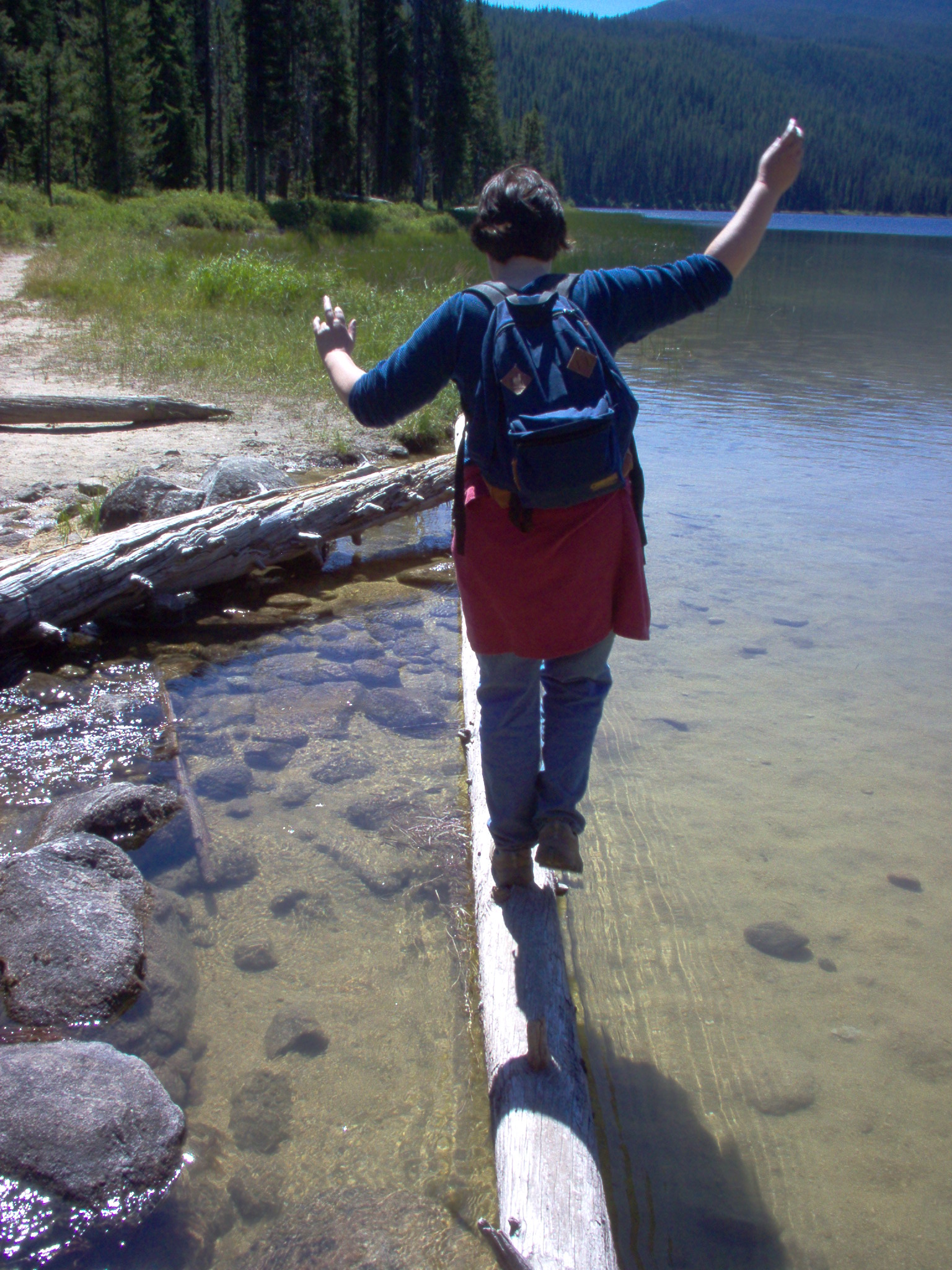 We had to get to the other side of the lake to visit the crashed B-23. It was either take off our shoes or cross on the log. We both made it across (and back) without getting our feet wet.