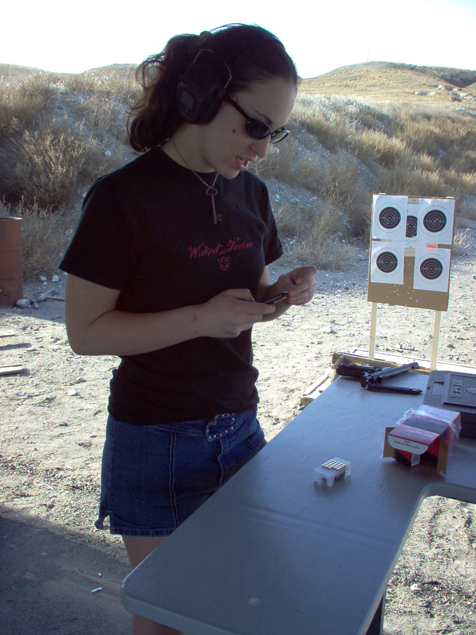 I started her out using a heavy barreled .22LR. The weight is similar to the larger caliber semi auto that she will ultimately need to be qualified on but the recoil is almost non-existent and the cost is minimal. This will enable her to develop the proper techniques without developing a flinch. And the reduced cost will allow her to fire thousands of rounds at about 1/10 the cost of the larger caliber handguns. Soon I will have her fire a few rounds from a larger caliber gun each session.