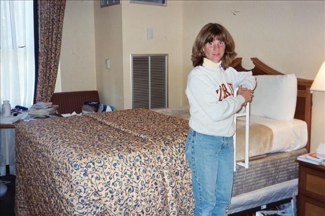 Lisa measures height of Jason's bed-notice extra box springs.