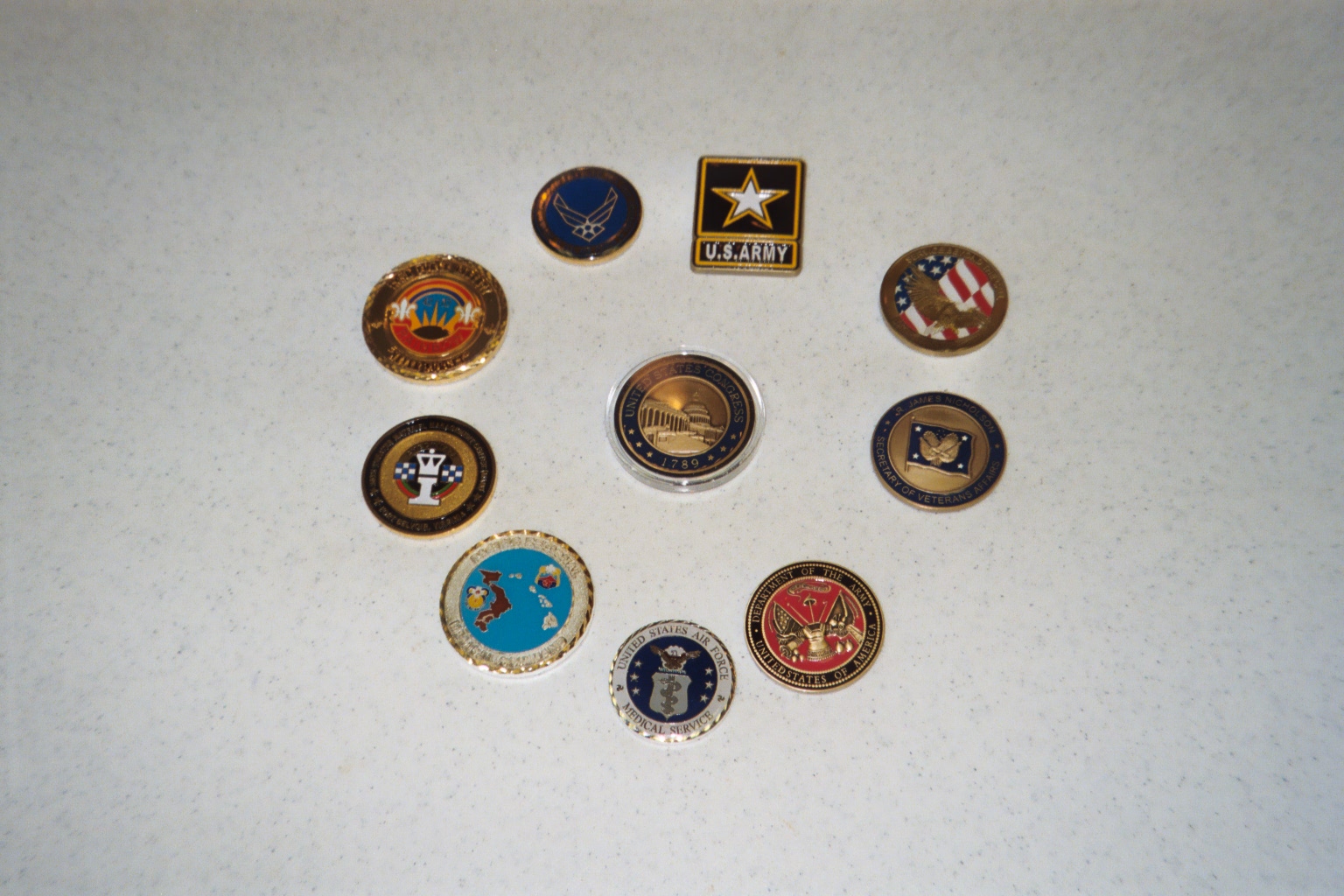 Service coins given to Jason by generals and colonels. The one in the center is from the House of Representatives--from Congresswoman Harris of Florida.