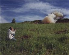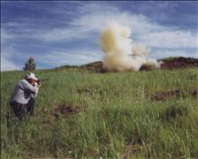 | The cloud of water vapor in the distance is 380 yards away. It was from a reactive target just 6" in diameter. Lisa hit her first one in just three shots. The second one took only two shots. The explosion can be heard many miles away. |