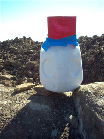 The red box on top is detonated with a rifle from 100 yards away. The milk jug has a inverted plastic cup in the bottom to form a shaped charge.
